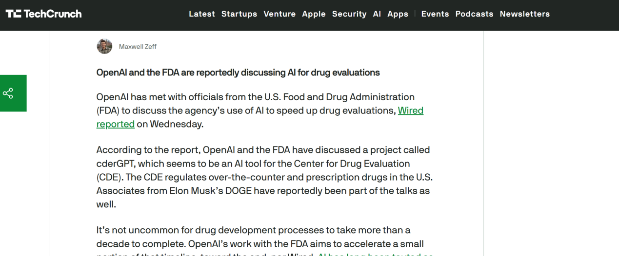 据悉,双方讨论的核心是一个名为cderGPT的项目,该项目由OpenAI提出,旨在开发一款专为药品评估中心(CDE)设计的AI工具。CDE作为美国药品监管的重要机构,负责监管非处方药和处方药的安全性与有效性。通过引入AI技术,双方希望能够有效缩短药物研发周期,特别是针对研发过程中耗时较长的最后阶段。